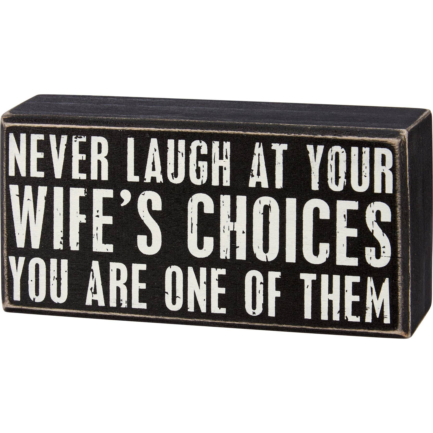 A classic black and white wooden box sign from our Box Signs Collection displaying a humorous sentiment that reads "Never Laugh At Your Wife's Choices - You Are One Of Them." Box sign features distressed details with coordinating black color on sides and back. Our Never Laugh At Your Wife's Choices box sign is easy to hang or can free-stand alone. A fun option for a wedding or anniversary gift and an everyday home accent with a variety of display options.
